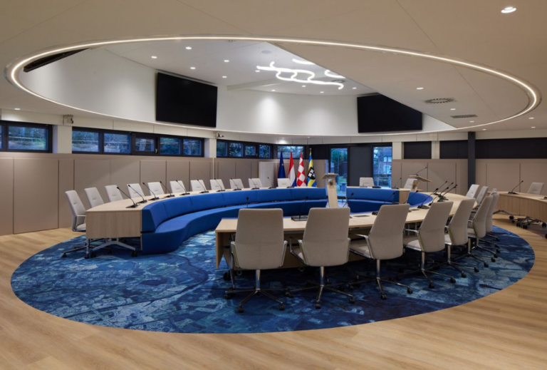 In the municipality of Drimmelen in Noord-Brabant, the council chamber was extensively renovated according to a design concept by M+R interior architecture. The aim of the refurbishment was to create a multifunctional space that can be used not only for municipal council meetings, but also for training, presentations and wedding ceremonies.