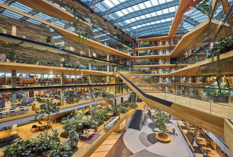 The Strawinsky House in Amsterdam has been redeveloped from a dull 70s office building to an inviting, transparent, and multifunctional venue. DLA Piper was charmed by the wide floors and visibility throughout the building and decided to rent almost 80% of the available spaces. Casper Schwarz Architects was selected to design the interior of the workspaces, hospitality areas and restorative spaces.